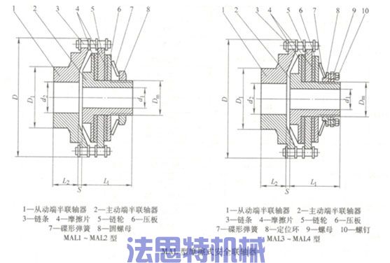 MAL型摩擦安全联轴器也叫限扭矩联轴器,主要结构为双排滚子链联接的联轴器加摩擦传动装置,是有弹性元件挠性安全联轴器的一种型式,工作时链轮与摩擦片之间可产生相对滑动,起安全保护作用,转矩根据碟形弹簧的压缩量而确定。MAL型摩擦安全联轴器可在同轴系中传动使用,也可以用单排链条在平行轴系中使用,性能相同。